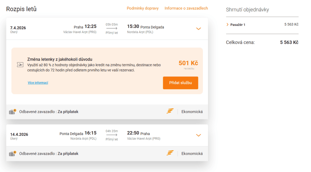 Letí se v jarním termínu 07-14.04.2026 – v úterý po obědě ve 12:25 letíte z Prahy, návrat je za týden v úterý v 16:15 z Azorů zpět do Prahy. Let operuje společnost Smartwings.