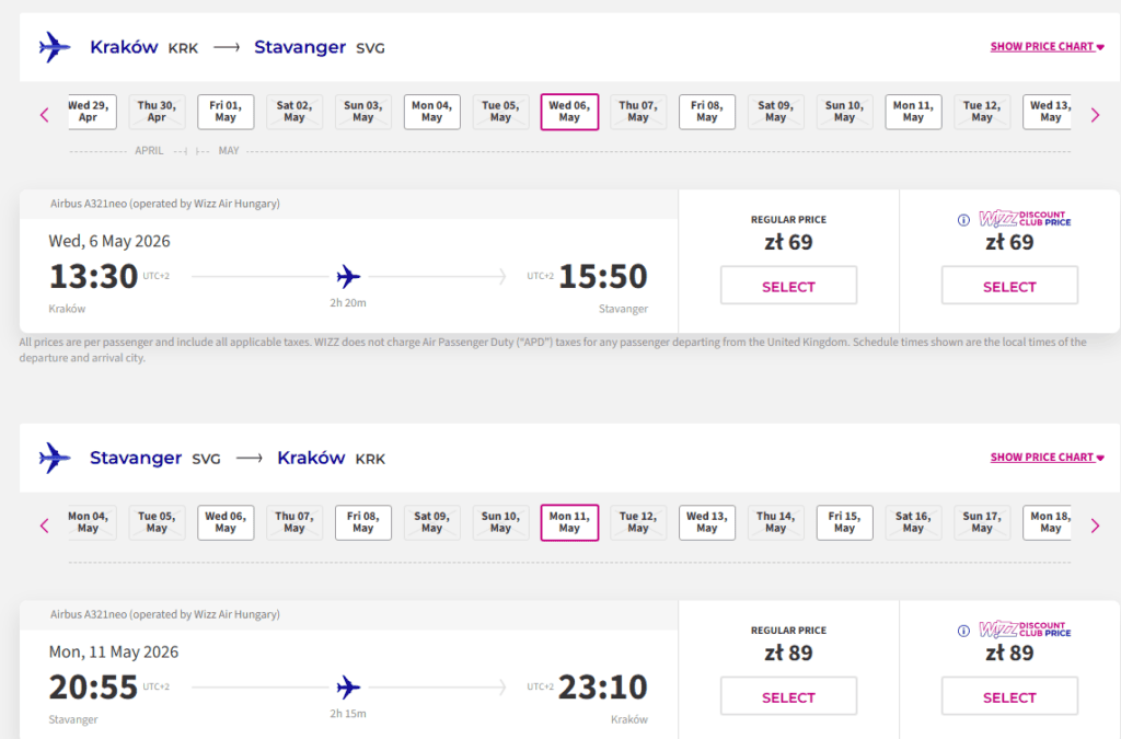Letět je možné v termínu 06-11.05.2026. Ve středu z Krakova odletíte a o 5 dní později v pondělí přiletíte zpět.