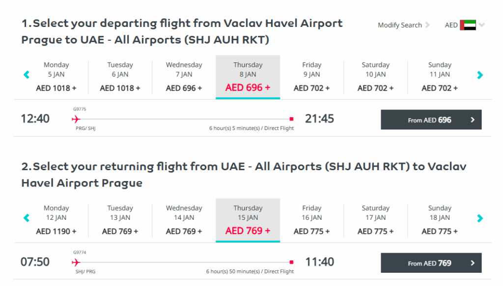 Air Arabia létá do Šardžá už z Vídně a Krakova. Například před pár měsíci nabízela aerolinka letenky za podobné ceny: